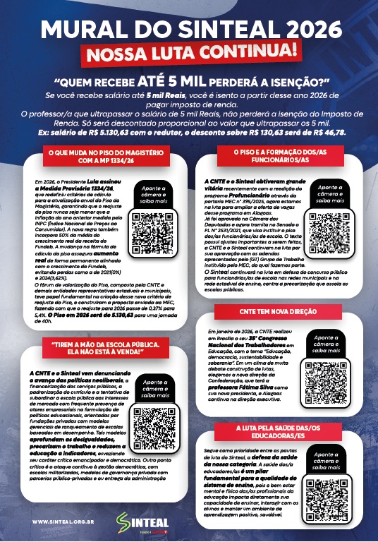 “E esse ano, a gente tem uma novidade. Já pensando na questão da sustentabilidade, de uso de muito papel, de muito material, a gente conseguiu reunir cinco textos muito importantes, mais um esclarecimento sobre a isenção do Imposto de Renda para quem ganha até R$ 5 mil, uma vitória muito grande da classe trabalhadora”, pontua. “A gente conseguiu reunir tudo num mural, cujo texto não está na sua integralidade, mas que pode ser lido por completo através de QR Codes. E quem quiser sugerir algo ou fazer algum questionamento sobre o material, basta entrar em contato com o Sinteal”, completa.