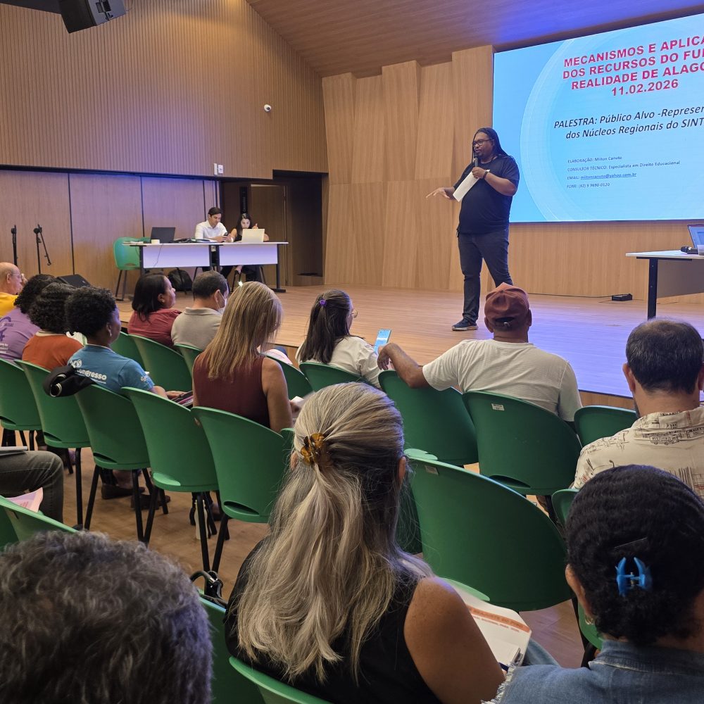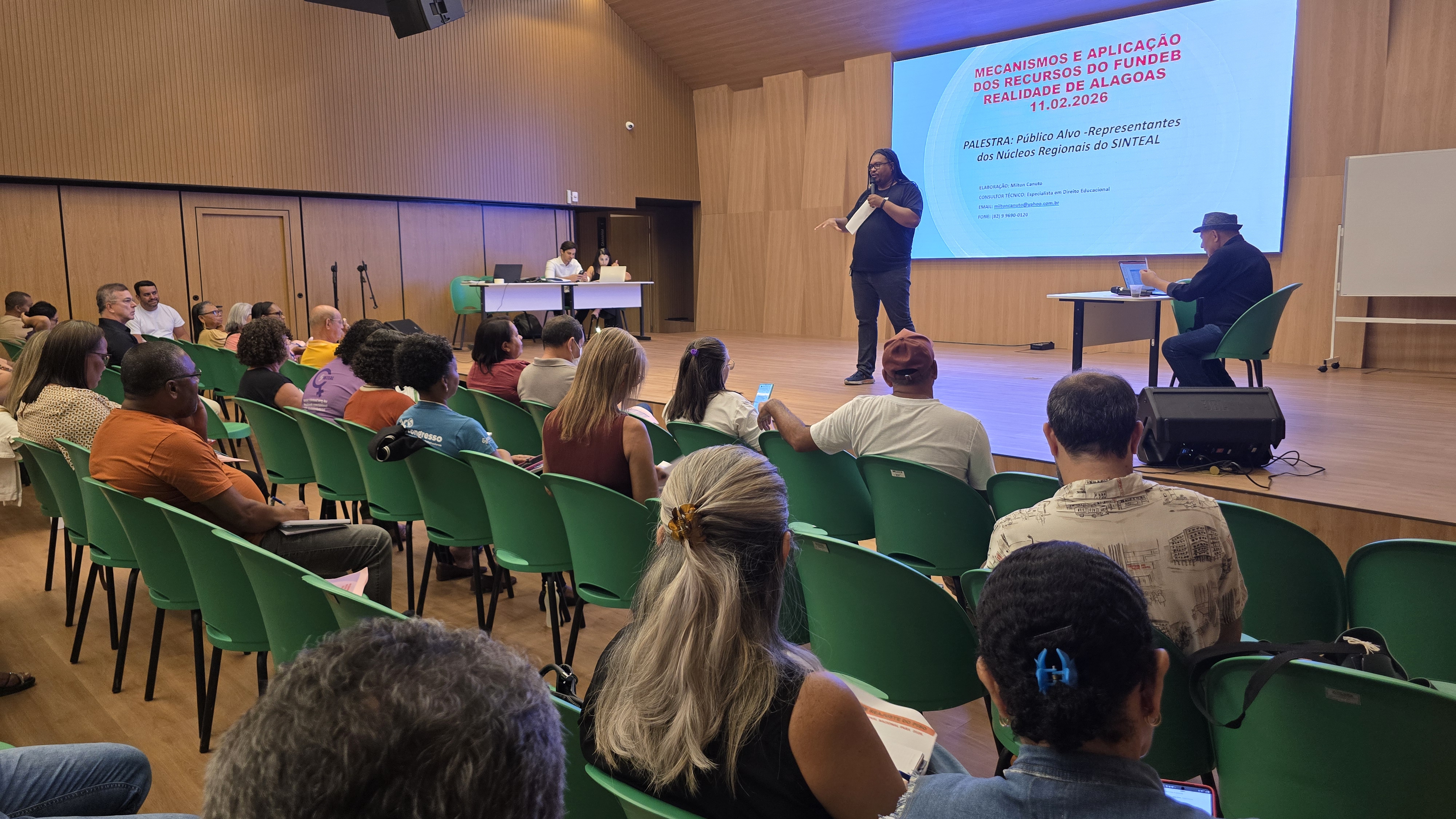 Ministrada pelo professor Milton Canuto, consultor técnico e especialista em direito educacional, a palestra trouxe dados atualizados sobre a legislação, os valores de recursos do FUNDEB previstos para 2026 em cada município, e apontou estratégias para as mesas de negociações que estão começando entre Sinteal e prefeituras.