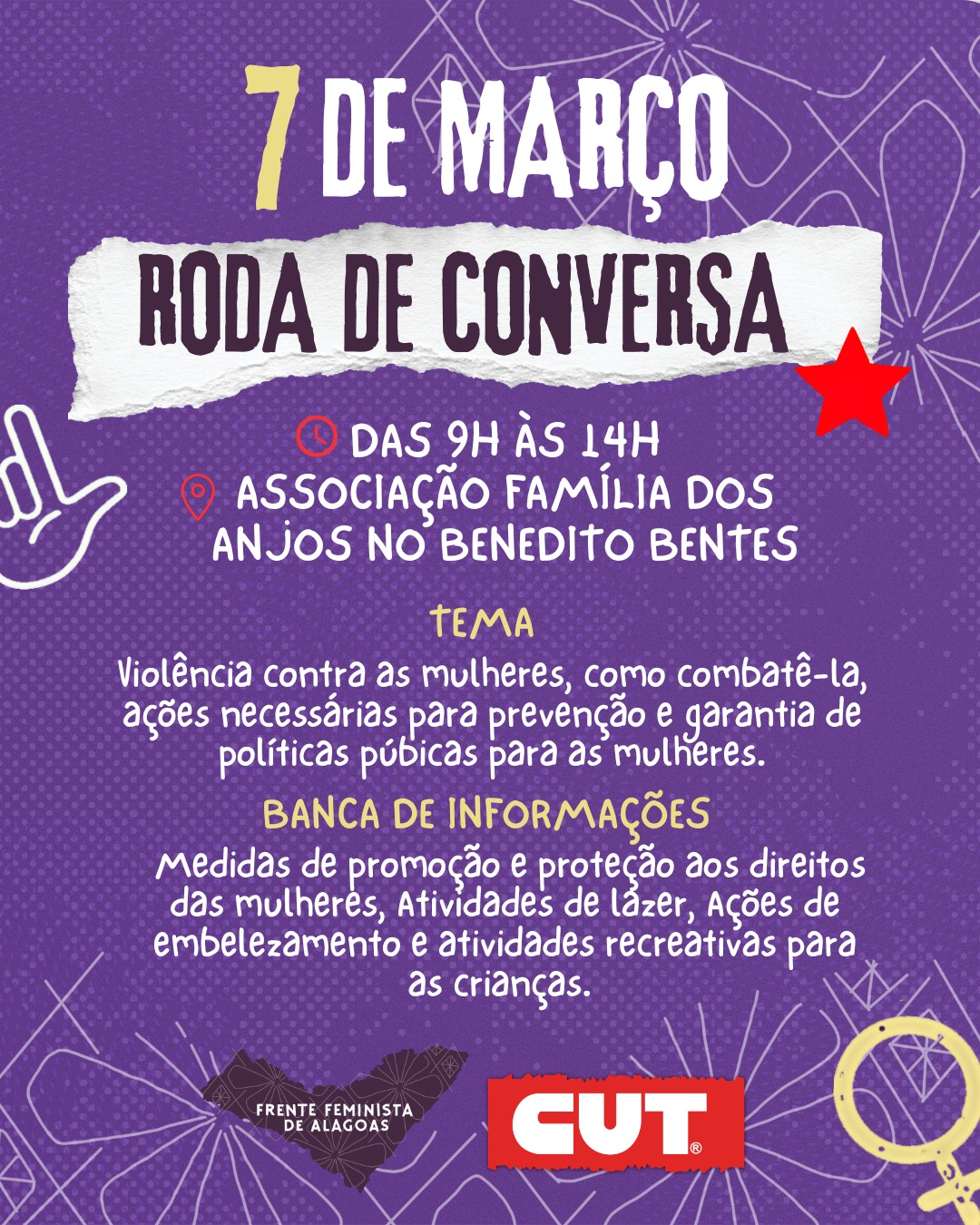 No próximo sábado, (07), de 9h às 14h, a Central Única dos Trabalhadores (CUT) em Alagoas, em conjunto com outras organizações da luta feminista, realiza uma Roda de Conversa com o tema “Violência contra as mulheres, como combatê-la, ações necessárias para prevenção e garantia de políticas públicas para as mulheres”. O encontro ocorrerá na rua em frente à Associação Família de Anjos e contará com tendas para distribuição de materiais informativos, escuta qualificada, atividades de defesa pessoal, oficina de cartazes, rodas integrativas de cuidados, feira criativa, cirandas atividades lúdicas para crianças.